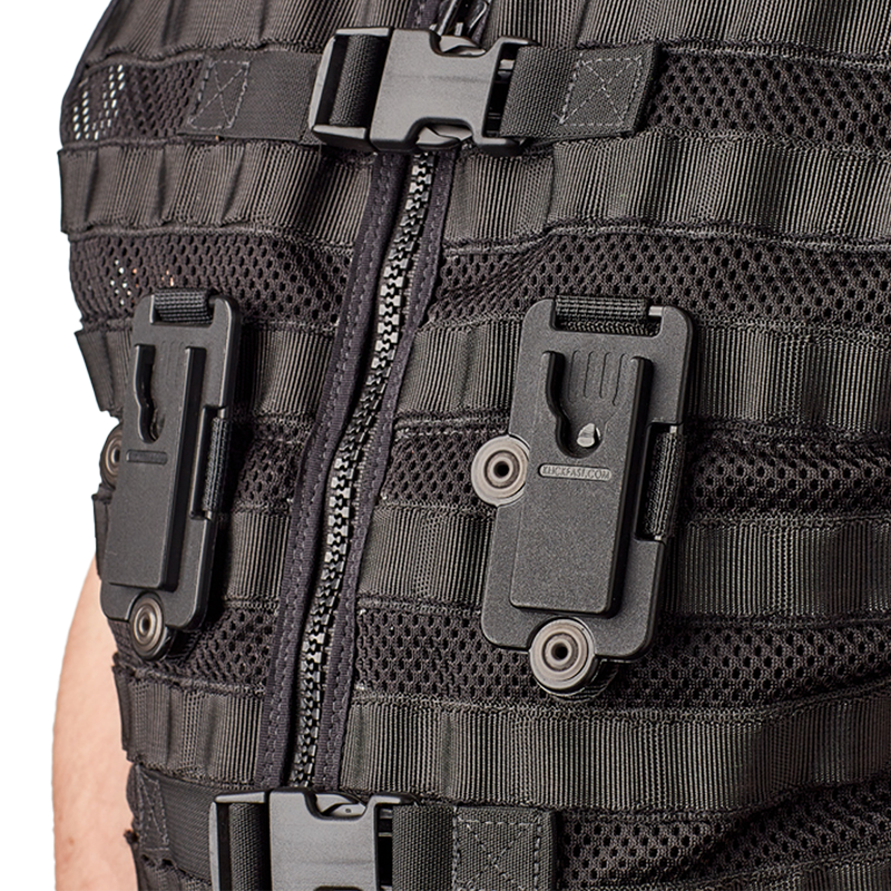 The Klick Fast MOLLE System allows secure and easy attachment to any MOLLE loop system found on utility vests, kit bags and other applications. The two webbing straps at the rear of the Dock allows it to be threaded either vertically or horizontally through a MOLLE loop, then secured in place with a heavy-duty press stud.